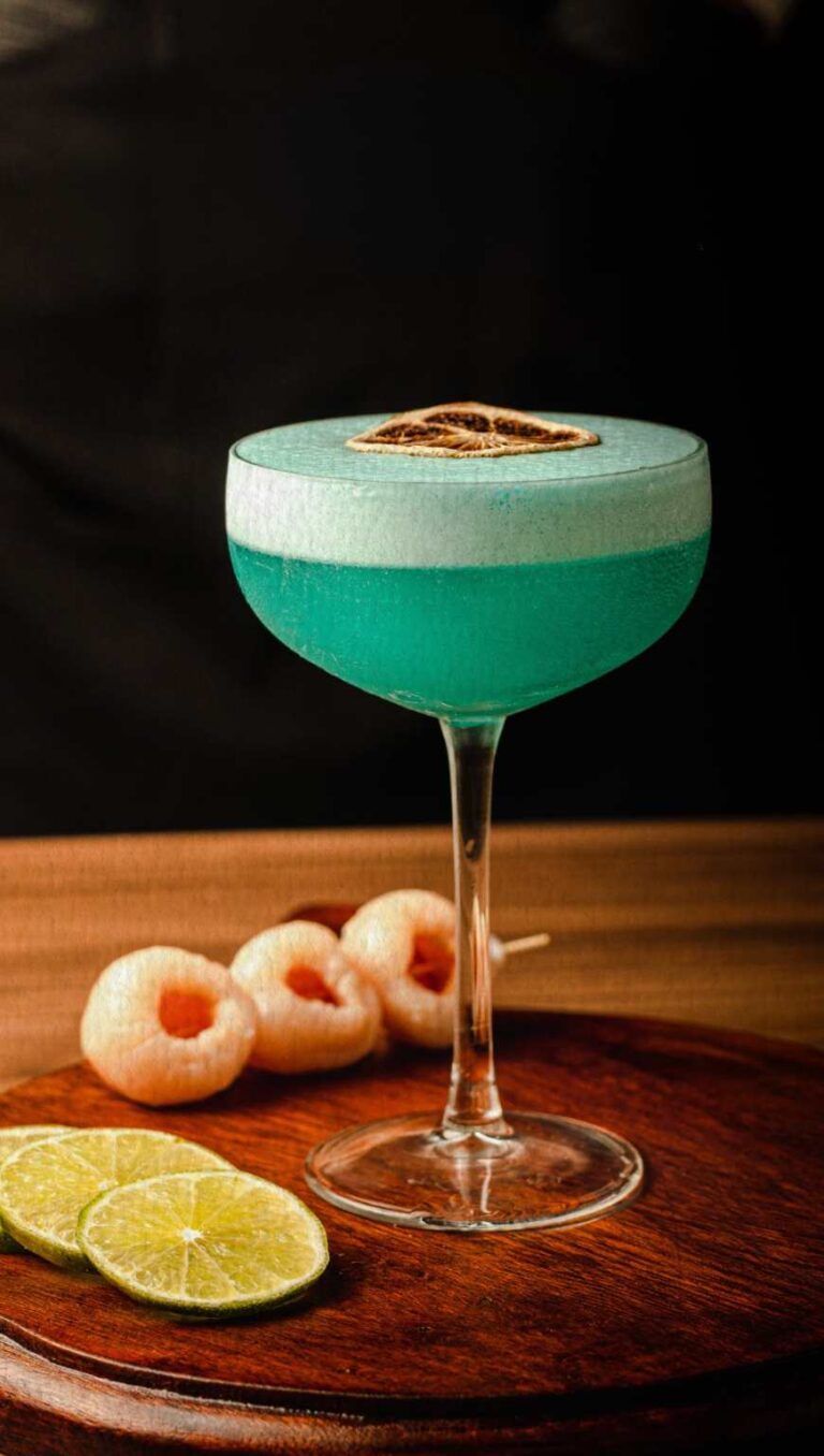 Ginebra Gordon’s, curazao azul, sirope de limón con lychees y aquafaba para una textura suave. Shakeado y servido en copa coupe, decorado con limón deshidratado.