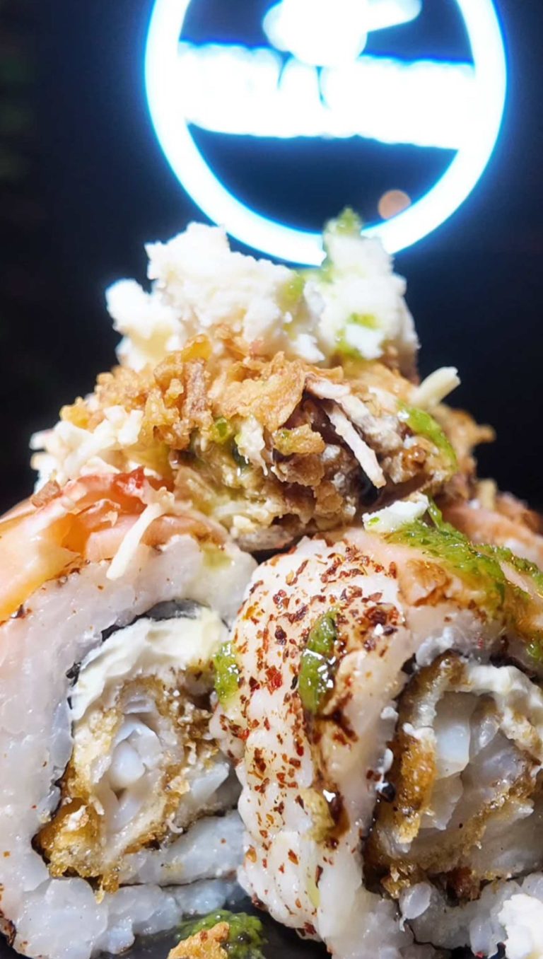 Rollo relleno de queso crema. salm贸n, aguacate, palmito y ceboll铆n chino, todo crocante en panko japones, coronado en crema de tilapia crocante.