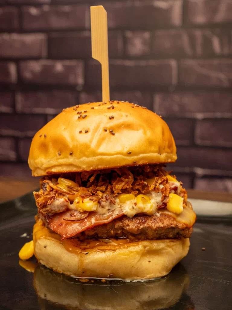 Pan de papa, 120 gr. de carne angus, dip de queso crema con maíz dulce, queso muenster, tocineta, chorizo santarosano, cebolla crispy, y salsa de la casa. Acompañada de papas fritas.