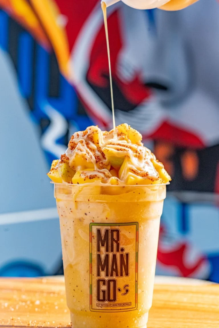 Granizado de crema de coco con lim贸n y trozos de mango, sal, taj铆n y leche condensada